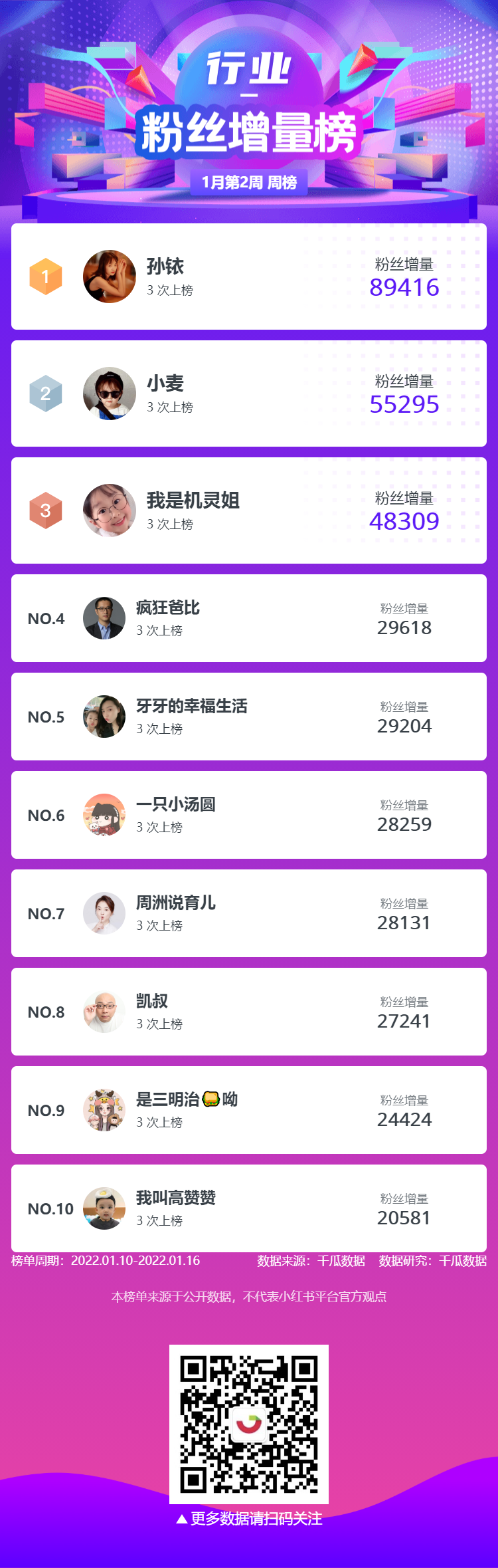母婴育儿行业-粉丝增量榜中“孙铱”排名第一,粉丝增量89416;“小麦”排名第二,粉丝增量55295;“我是机灵姐”排名第三,粉丝增量48309。