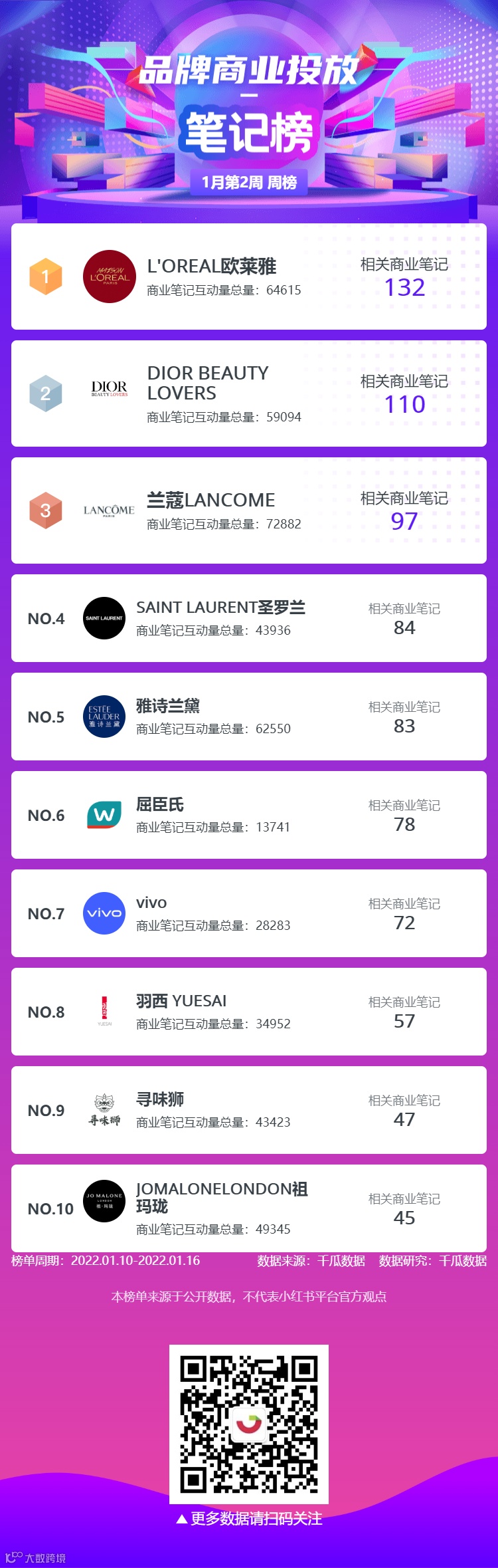 品牌商业投放榜-笔记榜中“欧莱雅”排名第一,相关商业笔记132;“DIOR BEAUTY LOVERS”排名第二,相关商业笔记110;“兰蔻LANCOME”排名第三,相关商业笔记97。
