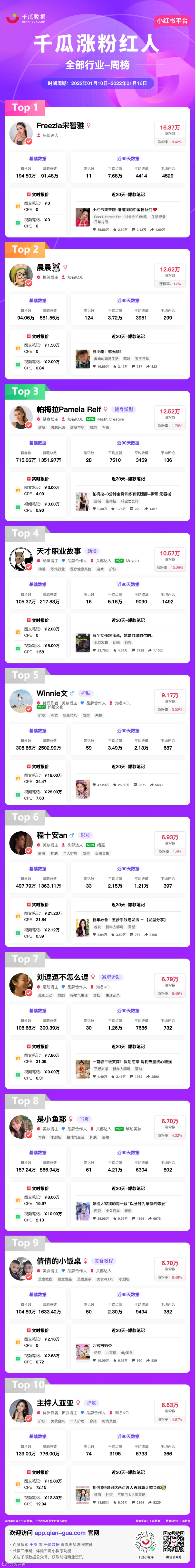小红书涨粉红人-全部行业中“Freezia宋智雅”排名第一,涨粉数16.37万;“晨晨”排名第二,涨粉数12.62万;“帕梅拉Pamela Reif”排名第三,涨粉数12.52万。