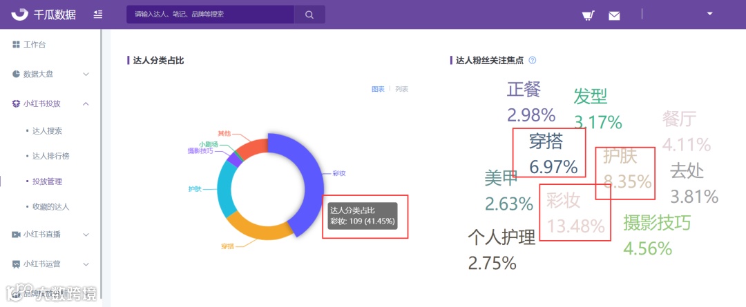达人分类占比中,彩妆类达人109位,占比41.45%;达人粉丝关注焦点前三分别为彩妆13.48%、护肤8.35%、穿搭6.97%,达人分类和粉丝关注焦点都比较集中。