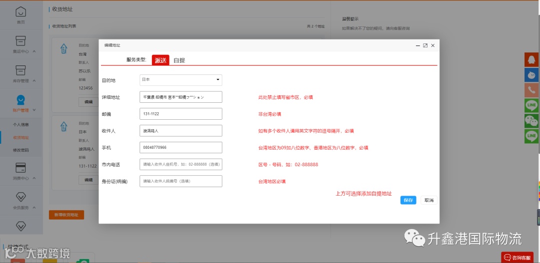 四、添加集运最终收货地址