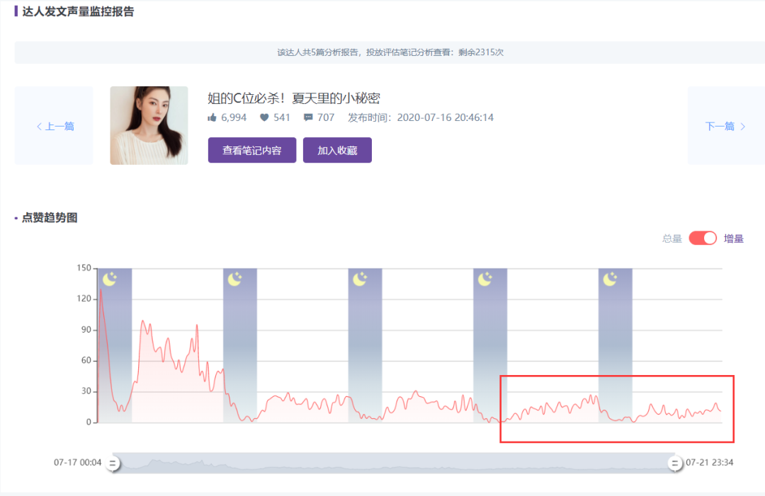 达人发文声量监控报告显示,张雨绮《 姐的C位必杀!夏天里的小秘密》的品牌合作笔记在发文后的短时间到达点赞峰值后,并没有完全消失,依然保持着较高点赞增长。
