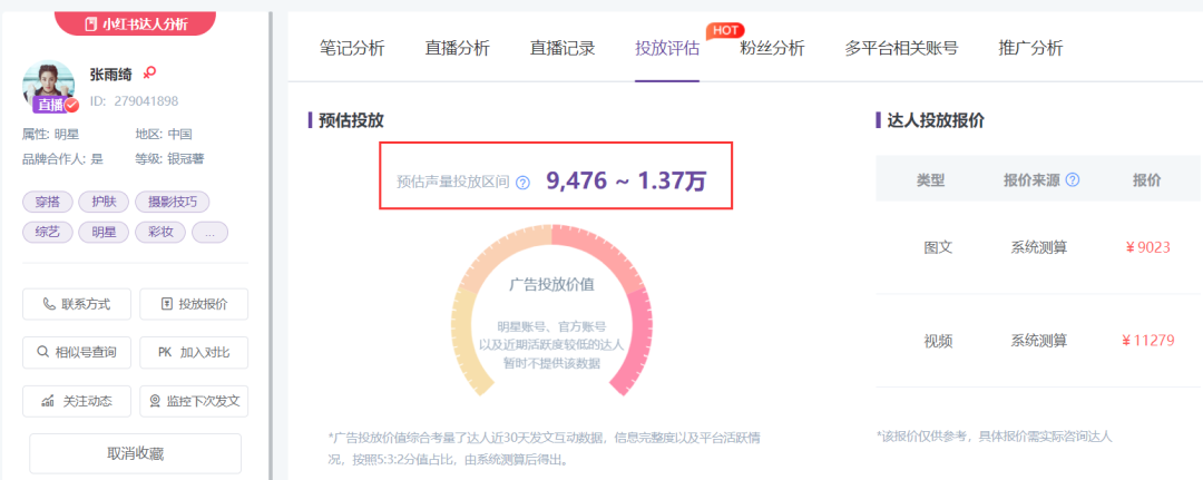,这是种草笔记发布后30天的内区间预估,对于商业笔记投放的声量预估有着较大的参考价值。