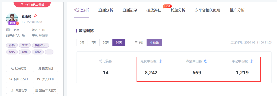 ,进行商业笔记投放更有可能获得更佳的长尾流量,是目前比较适合投放商业笔记的明星之一。