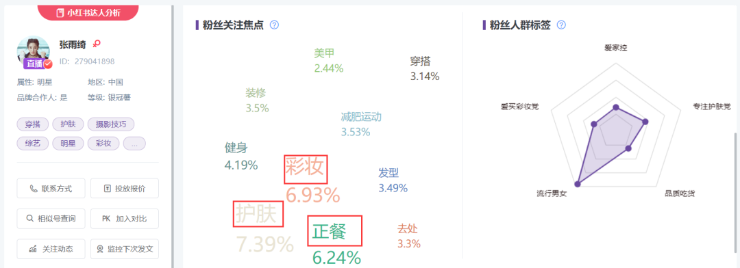 入手,比如张雨绮的粉丝关注焦点前三的是护肤、彩妆以及正餐,符合其粉丝调性的产品进行品牌合作笔记的投放,种草效果更佳。