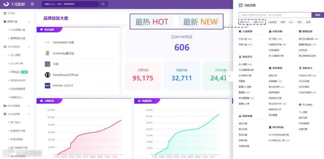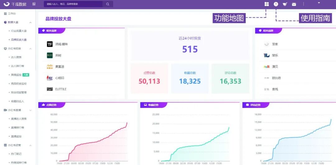 随着越来越多的品牌商家使用千瓜数据,为提高用户使用感,帮助大家了解产品功能优势,千瓜数据全新上线了功能地图和使用指南,另外在小红书笔记分析处新增了笔记数据趋势图,方便用户更加全面、直观的看到小红书笔记数据,了解笔记传播效果。