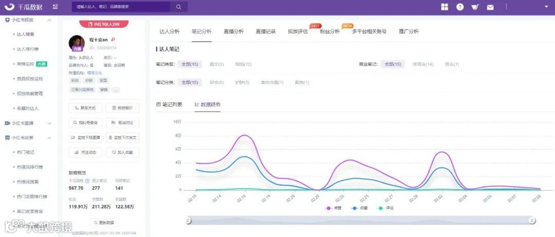 此次笔记分析功能更新针对单篇笔记数据和达人近期笔记数据做了数据趋势图,用户可以清晰的看到每一篇笔记的具体数据变化和整体数据趋势。