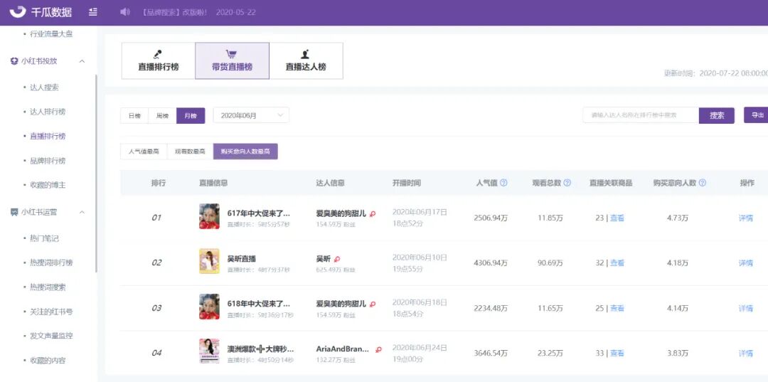 随着小红书直播带货兴起,直播数据已经成为品牌方最关注的焦点之一。千瓜数据从用户需求的角度出发,对直播排行榜进行全面升级,推出直播排行榜、带货直播榜和直播达人榜,为品牌方、MCN机构以及创作者等用户的带货直播运营提供全方位的数据支持。