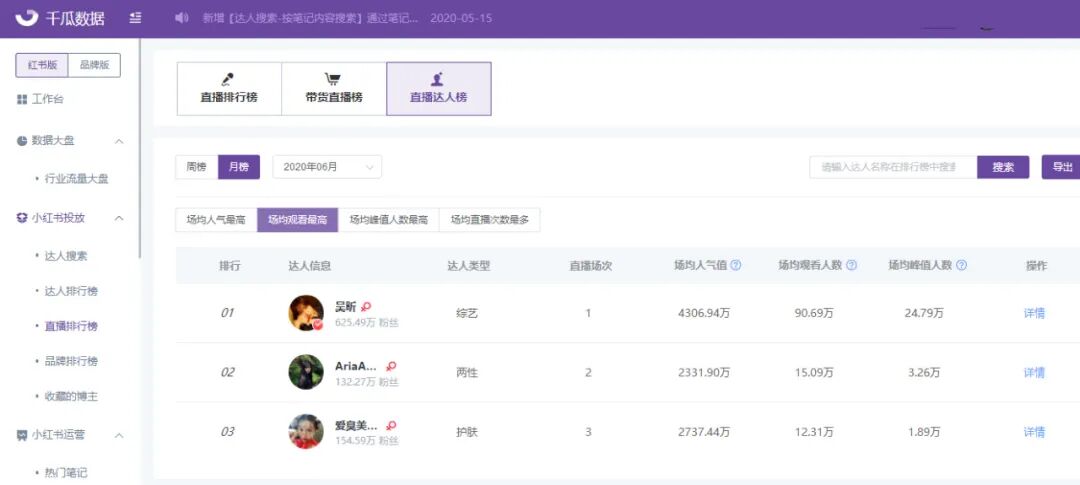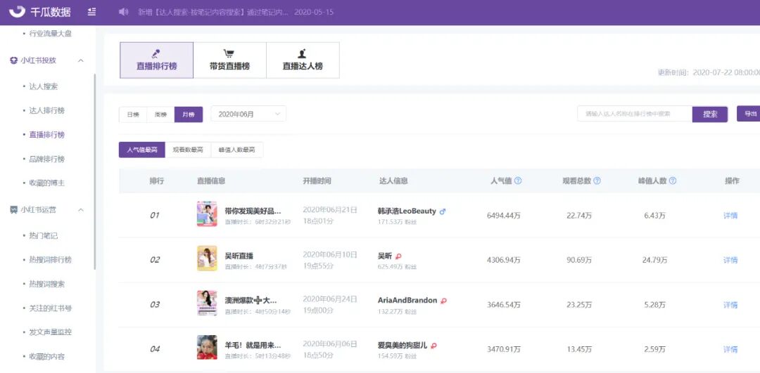 直播排行榜根据单场直播的人气值、观看人数以及峰值人数进行排序的。比如韩承浩6月21日“带你发现美好品牌!大牌五折!”的直播人气值6494.44万。观看人数22.74万,峰值人数6.43万。品牌方通过该榜单可以得知一定时间内小红书所有直播的数据,了解小红书直播的整体数据情况。为直播运营提供整体数据参考。