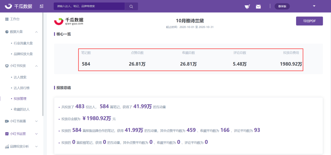 品牌商家想要不断提高营销的ROI,参考其他品牌的投放是重要途径之一,更重要地是对自家品牌营销投放的复盘。千瓜数据投放管理功能够根据用户添加的品牌合作笔记以及软值笔记,生成专属的品牌投放报告,为品牌复盘小红书双十一营销种草提供多维度客观的数据支持。