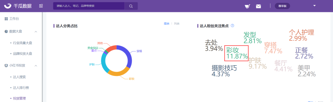 投放报告显示,10月份雅诗兰黛品牌合作笔记的达人分类占比前三为穿搭、彩妆、护肤,占比超过80%;达人粉丝关注焦点前三为彩妆、护肤、穿搭,占比接近30%,同样预算的品牌合作笔记投放能够触达更多的目标用户人群,雅诗兰黛在达人选择方面非常契合品牌调性。