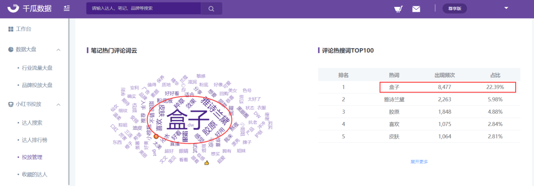 笔记热门评论词云显示:评论热搜词“盒子”出现频率超过“雅诗兰黛”,占比高达22.39%。这跟小红书流行惊喜盒子玩法不无关系,双十一期间进一步促进了盒子玩法的增长。小红书用户对惊喜盒子营销的认可度极高,其本质依然是利益过渡。值得一提的是,为了不伤害品牌的调性,越来越多的品牌开始采用赠品的形式,而非一次次打破价格底线。