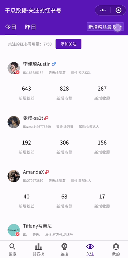 输入达人名称通过模糊匹配,查看相关联达人数据,便于进行进行关联达人数据对比查看。