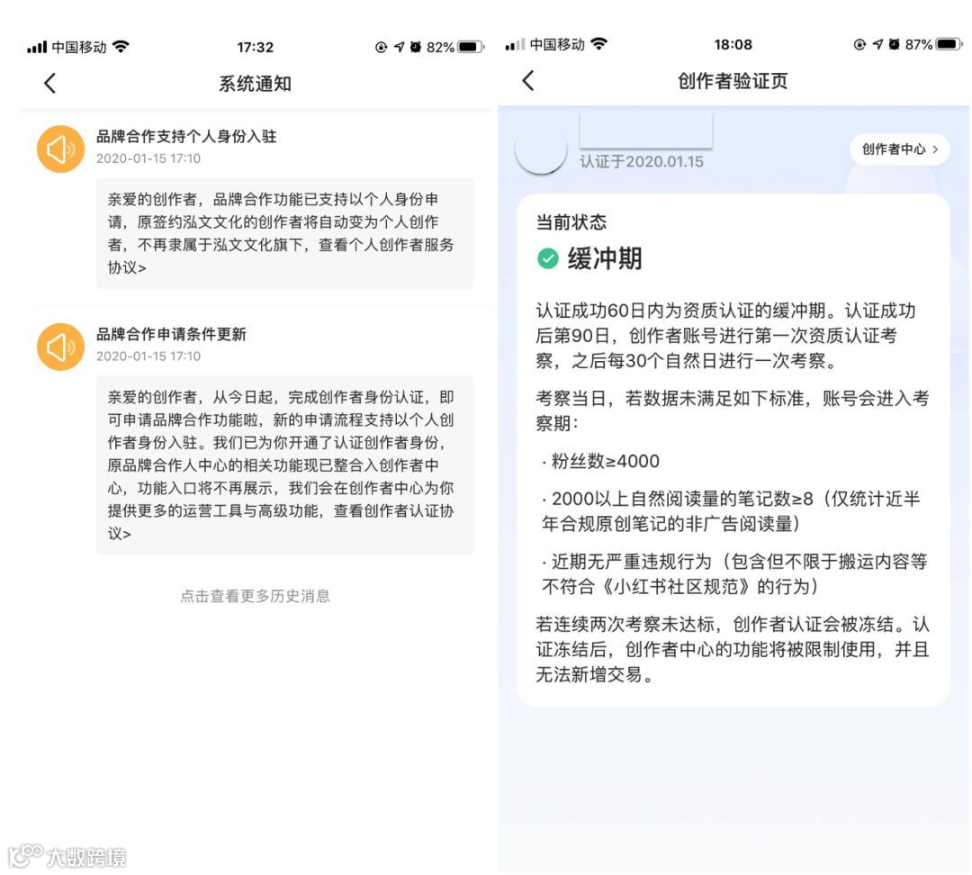 虽然申请条件没有太大变化,但是这次的创作者认证确可以看做是小红书官方对已认证达人更进一步的管理,数据不达标即进入考察期,两次不达标认证即被冻结。