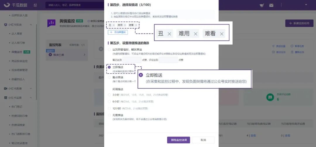第四步选择舆情词,运营根据品牌的实际情况自行添加舆情词,如:丑、难看、难用,当监测到的笔记中出现这些舆情词时,系统将会通过千瓜公众号发送预警通知消息;