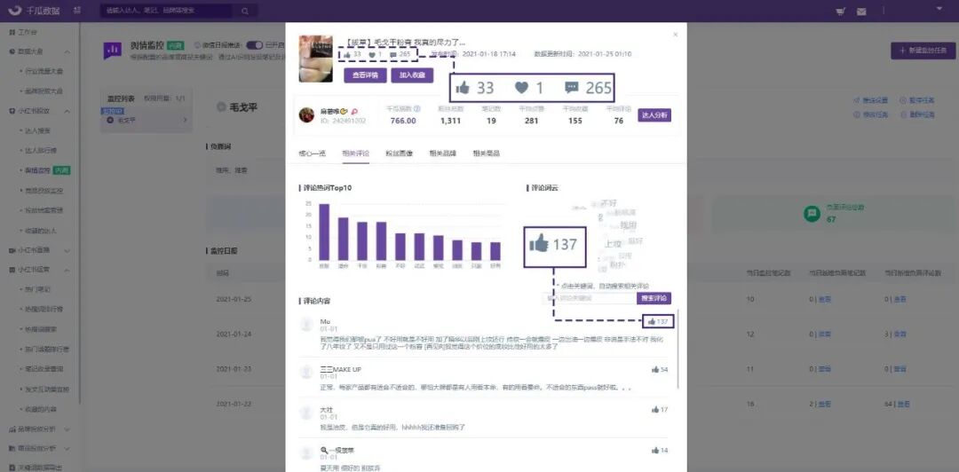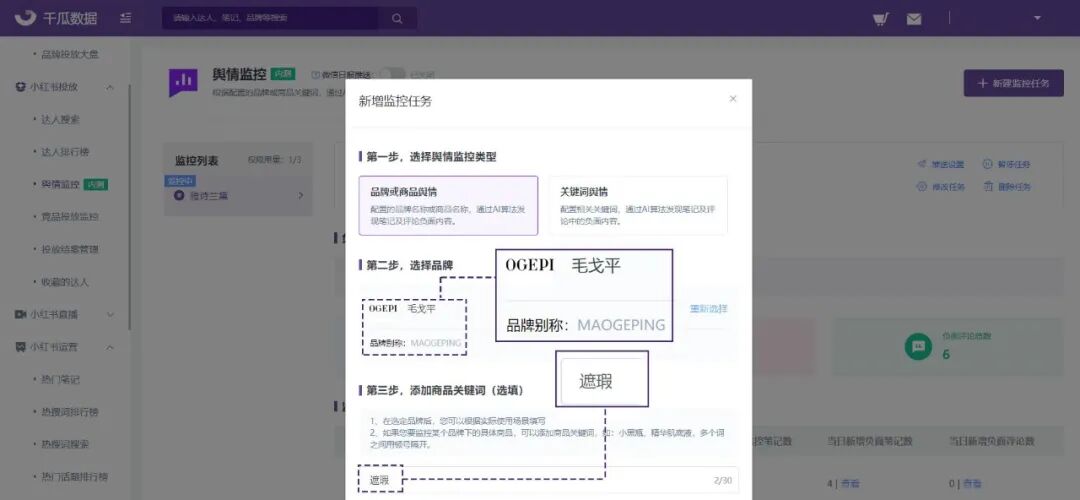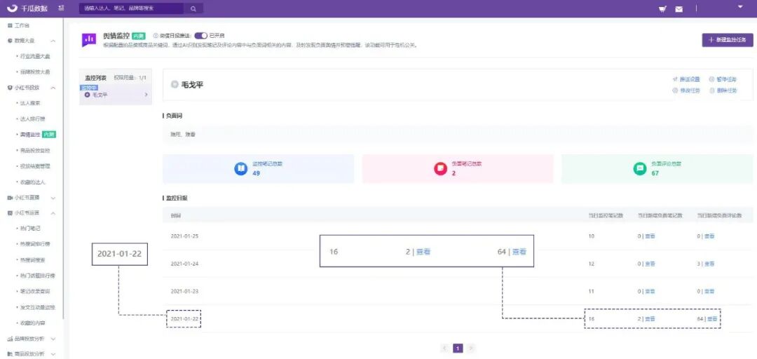 千瓜数据为品牌主推出了舆情监控功能,位于小红书投放版块中,可以根据配置的品牌或商品关键词,通过AI识别发现笔记及评论内容中与负面词相关的内容,及时发现负面舆情并预警提醒。