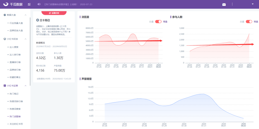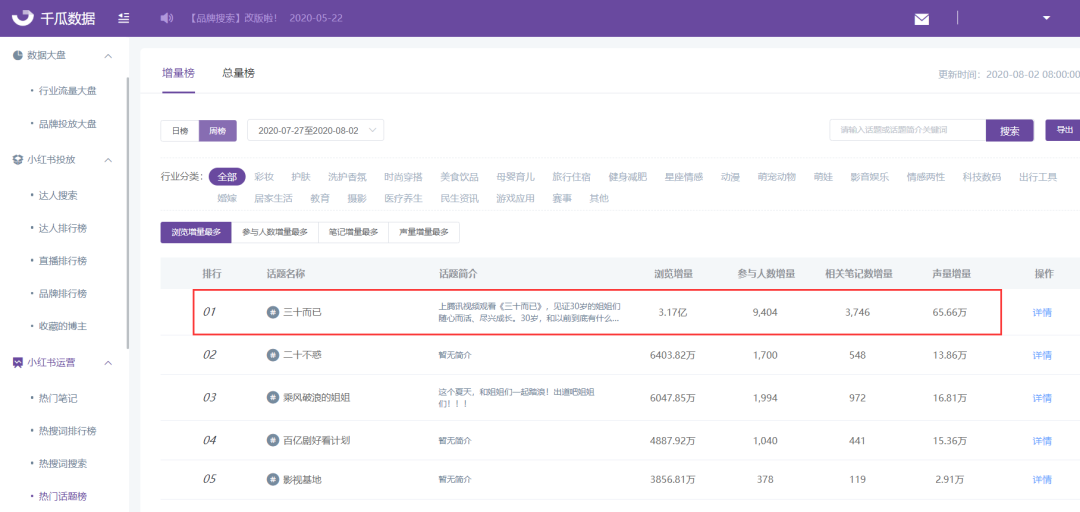 热门话题榜在小红书运营模块下,分为增量榜和总量榜。热门话题增量榜周榜(2020年7月27日—8月2日)排名第一的是近期最热门的电视剧《三十而已》,一周