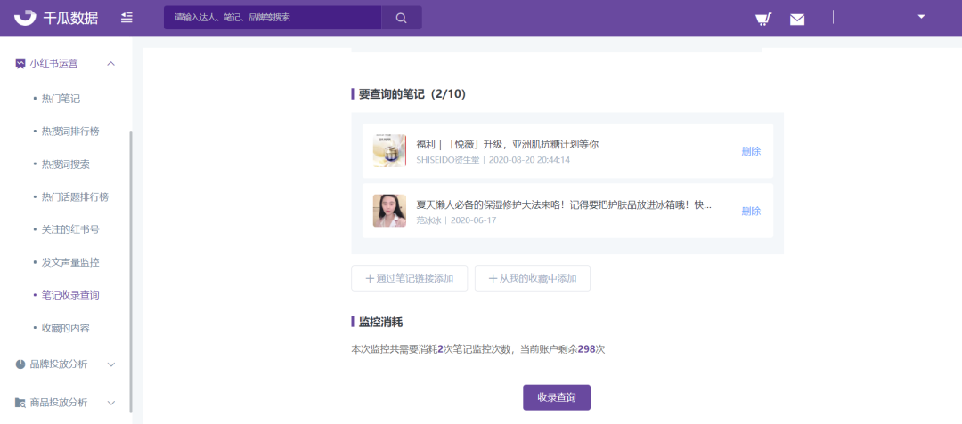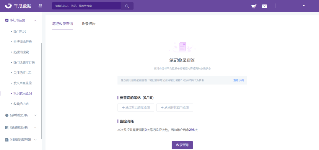 小红书笔记收录查询功能位于小红书运营下,可以同时查询10篇笔记的收录情况。有两种方式添加要查询的笔记,一是通过笔记的链接添加,二是从我的收藏中添加。每查询一篇笔记需消耗1次笔记监控次数。