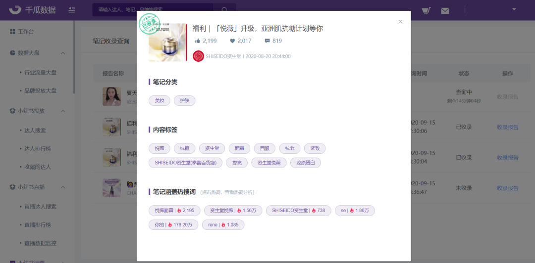 收录报告会显示是否收录、笔记分类、内容标签、笔记涵盖热搜词。比如资生堂的《福利|悦薇升级,亚洲肌抗糖计划等你》笔记。