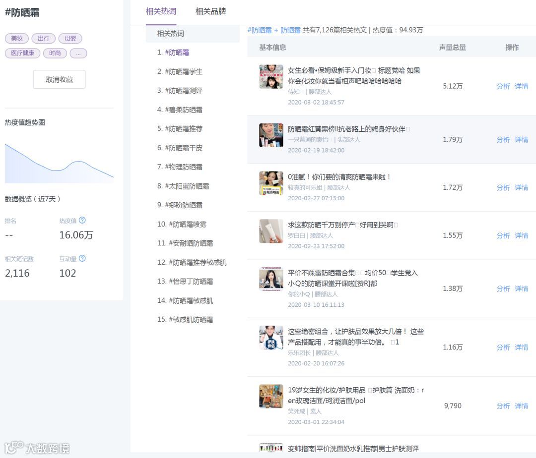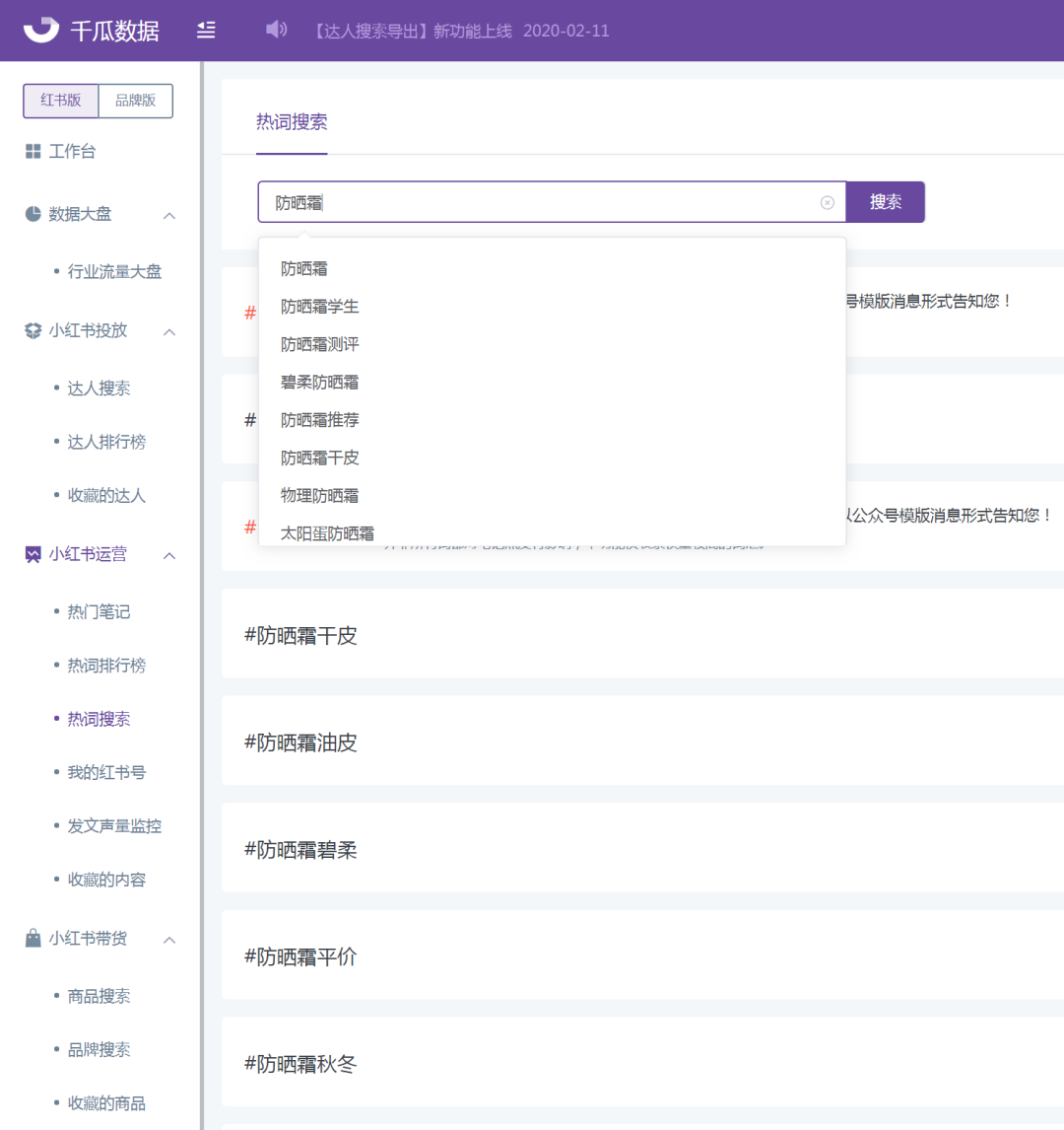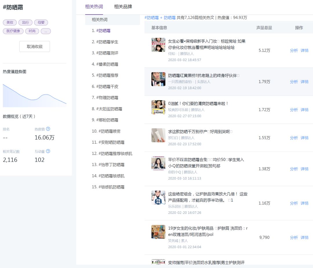 “千瓜数据-小红书版” (qian-gua.com)是专业的小红书数据分析平台,收录有2020年最新的小红书搜索关键词分析数据,能够分析出热词的热度趋势、相关长尾关键词,以及热词相关的热门文章,可以帮助品牌快速定位用户核心关注点,把握广域流量池。