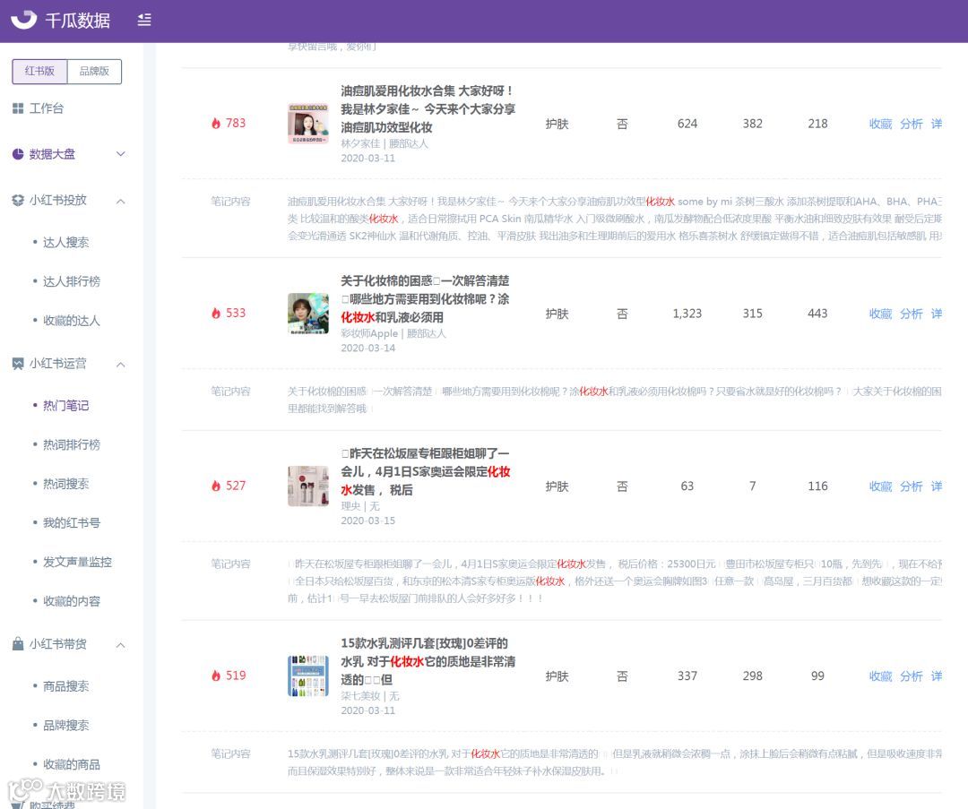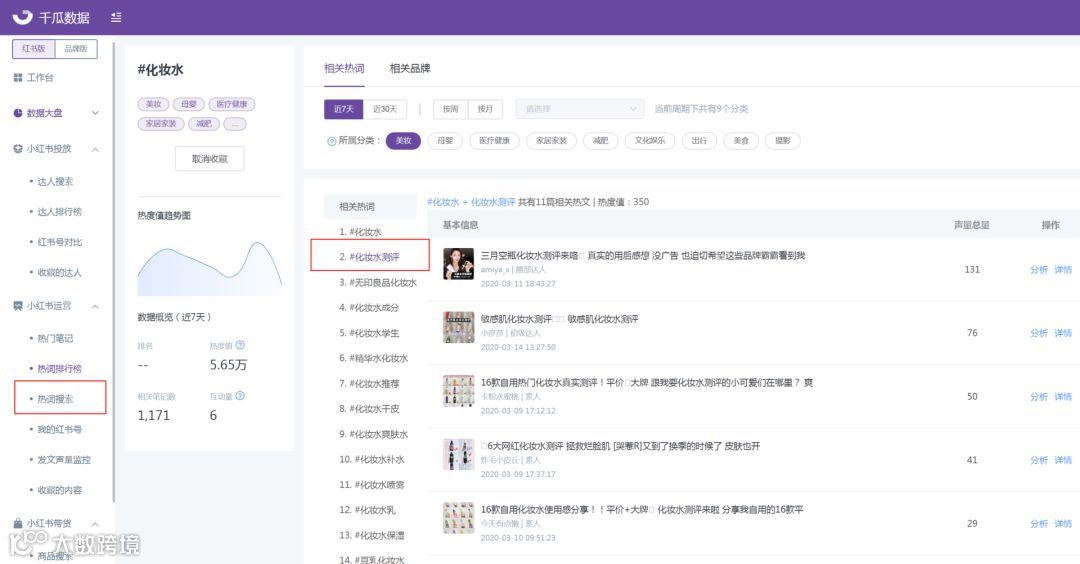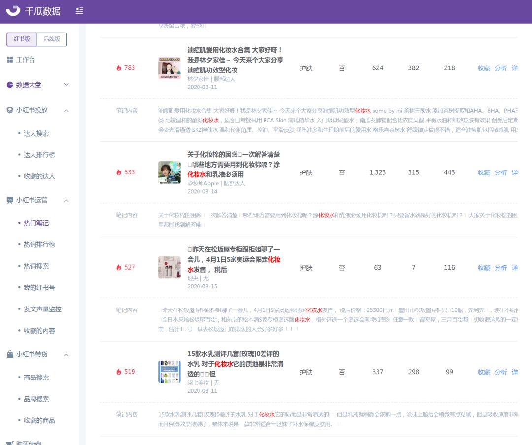 小红书上关于化妆水的评测推荐(千瓜数据-小红书版)