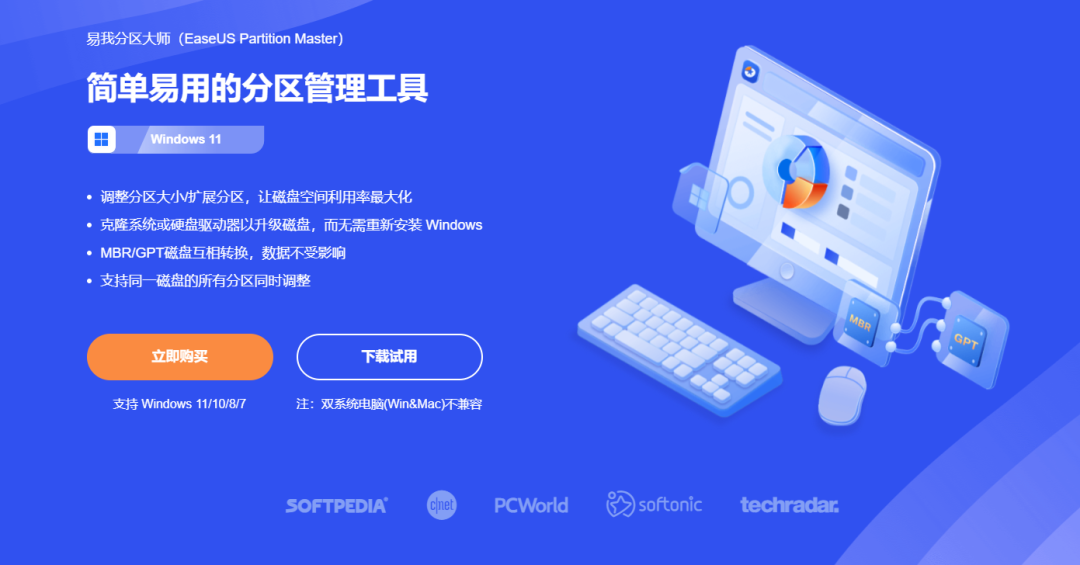 如果想调整已有分区大小、合并分区,或者C盘满了想从D盘划空间,系统自带工具就不够用了,这时候易我分区大师就是救星!