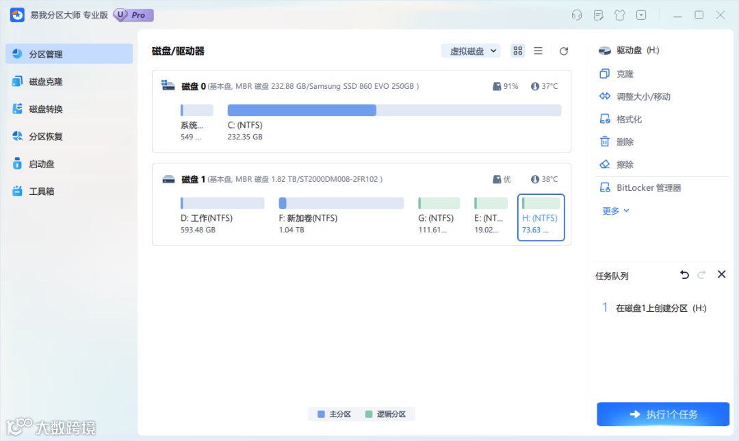 步骤4. 在返回的页面点击右下角【执行1个任务】,如果需要撤销可在“任务队列”进行,随后在弹出的窗口点击【应用】,开始执行操作。