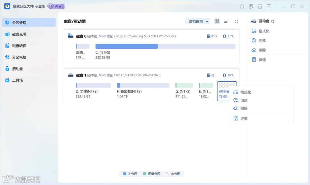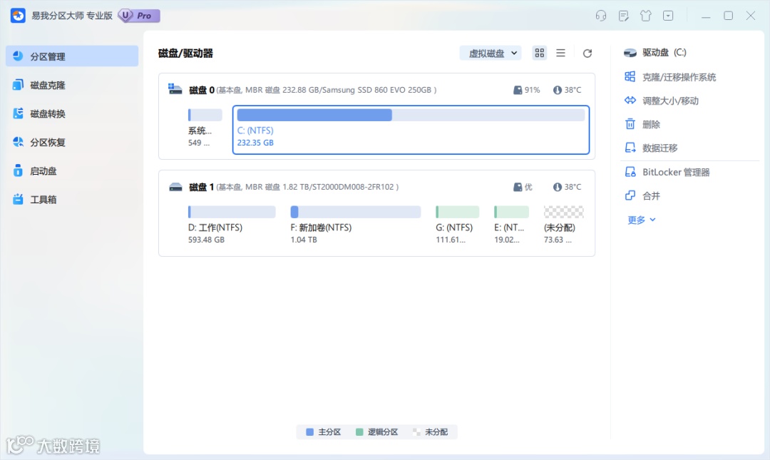 易我分区大师(EaseUS Partition Master Professional),它的分区功能强大,支持无损分区调整、分区合并/拆分、批量分区等复杂操作,且操作界面友好,兼顾了专业性和易用性,适合需要对硬盘进行精细化管理的用户。