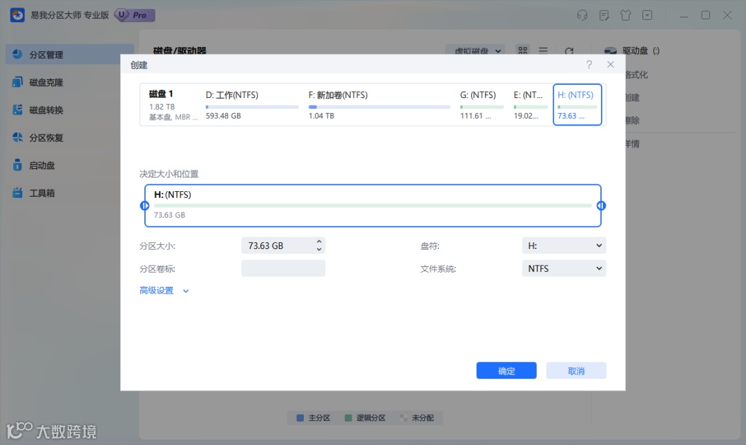 步骤3. 在弹出的界面设置创建分区的盘符名称、大小、文件系统格式等,设置好后点击【确定】。
