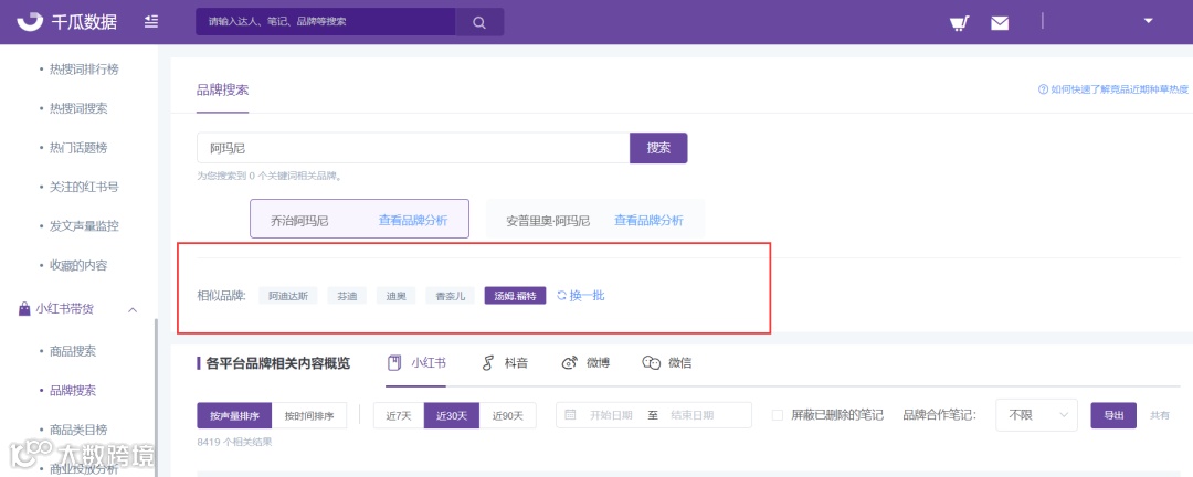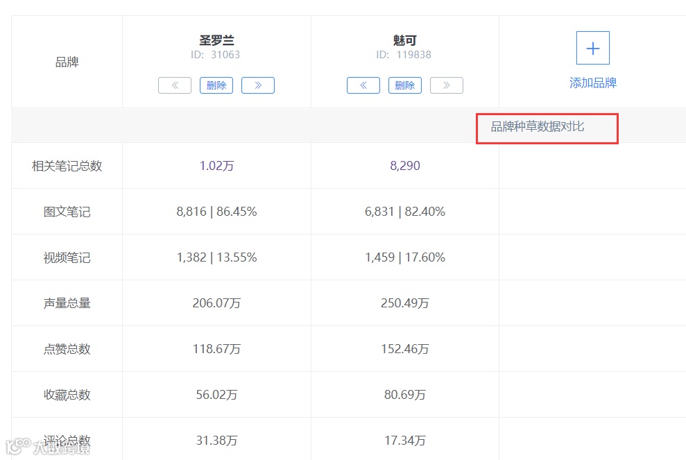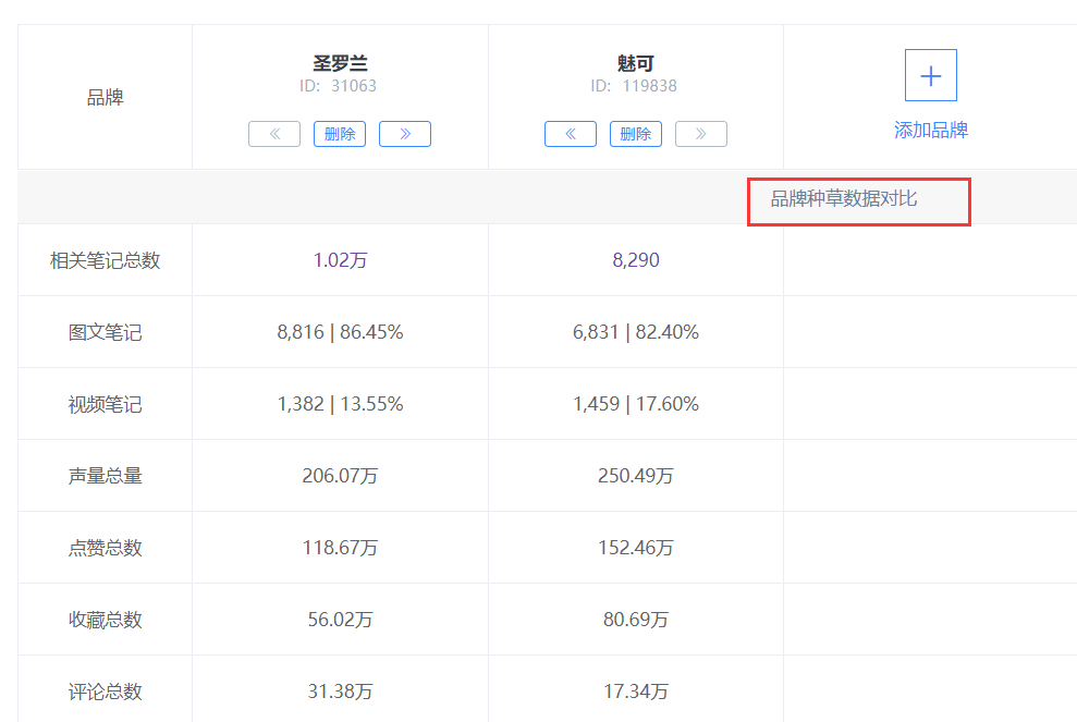 在小红书投放栏目下的品牌搜索页面以及右上角的“对比”即可随时发起品牌PK,品牌对比数据分为品牌种草数据对比和商业投放对比两大模块,通过品牌PK案例来详细了解下。