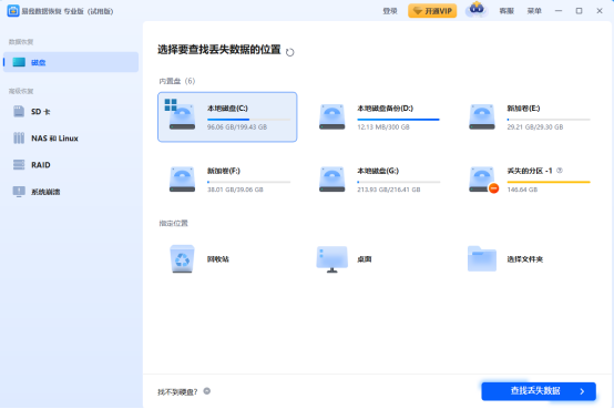 2.选择扫描位置:打开软件后,精准选择录音原本存储的分区或文件夹。外置设备需先连接电脑再选择对应盘符。点击“查找丢失数据”启动扫描,过程中可随时暂停查看结果。