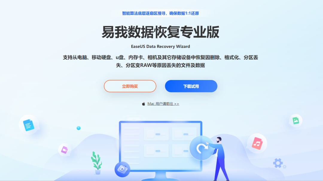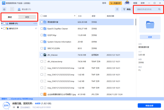 若前置技巧无效,说明录音已被系统标记为“永久删除”,此时需借助专业工具。易我数据恢复软件支持电脑硬盘、U盘、移动硬盘等多种存储设备,兼容常见音频格式,是恢复永久删除录音的高效选择。