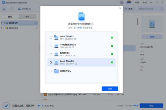 4.安全恢复:勾选目标录音,选择与原存储位置不同的保存路径(比如原在电脑硬盘,保存到U盘),避免覆盖原始数据,最后点击“恢复”等待完成即可。