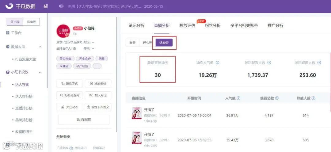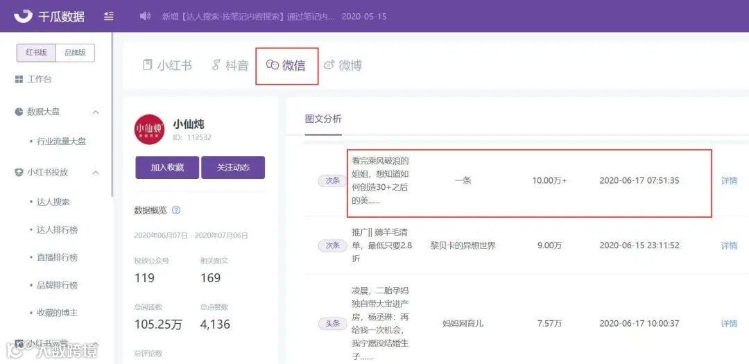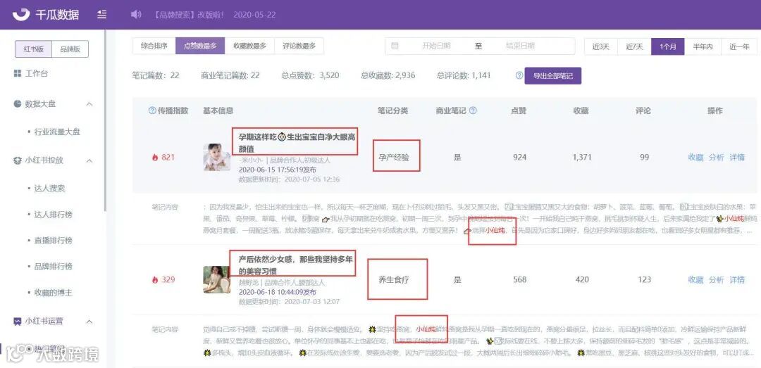 小仙炖在5月19日到6月5日密集投放了9位明星的商业笔记,在投放的时间节点都带来了较大声量。特别是5月19日两篇商业笔记,就有17752的声量,明星笔记的效果可见一斑。