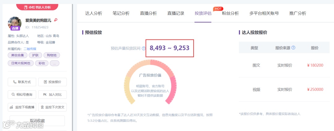 达人投放价值在投放评估中也有清晰的呈现。通过预估投放声量区间和达人投放报价,可以计算出单位声量的成本。当然,需要注意的是小红书的长尾流量较佳,该数值仅为发布后30天内区间预估,所以实际声量大概率高于预估声量。