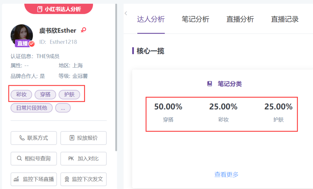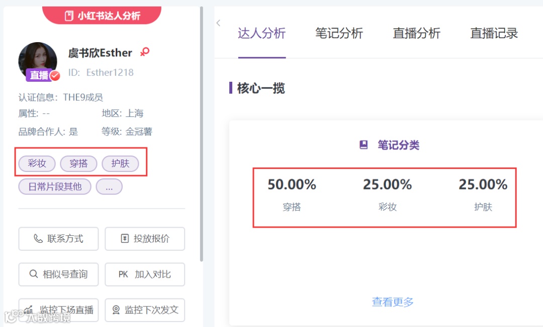 内容的垂直度,也会影响KOL报价。达人的内容垂直度可以从笔记分类、达人标签进行判断。笔记分类是内容垂直度的主要判断标准,虞书欣的笔记分类,穿搭占比50%、彩妆占比25%、护肤占比25%,达人标签也是这三个,内容垂直度非常高。