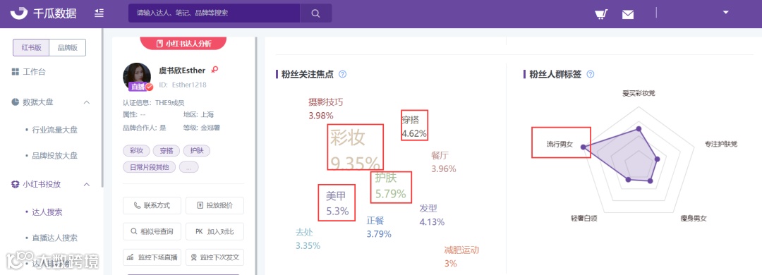 要求内容垂直度,其根本目的是为了精准种草某一类粉丝人群。虞书欣的粉丝关注焦点前四分别为彩妆9.35%、护肤5.79%、美甲5.3%、穿搭4.62%,粉丝人群标签为流行男女。粉丝关注焦点主要集中在彩妆护肤方面。
