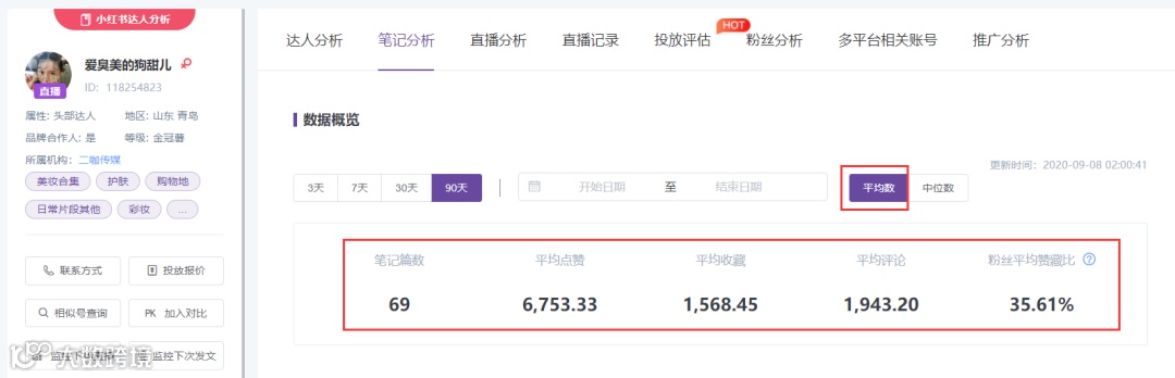 笔记数据中位数显示,近90天笔记点赞中位数为7099,收藏中位数1344,评论中位数1555。不仅数值高,而且笔记数据平均数和中位数比较接近,说明“爱臭美的狗甜儿”的笔记声量(赞藏评数据)稳定性好,投放品牌合作笔记的ROI较为稳定。