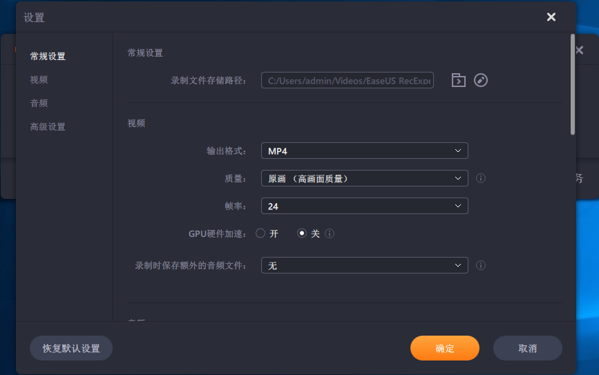 选择录制场景后,点击页面右方「设置」,根据自己的需求在常规设置、视频、音频、高级设置里面进行详细设置。其中最常用的可以设置快捷键以及视频保存路径、输出格式、清晰度、帧率等,想要高清效果的清晰度选择高清或原画即可。