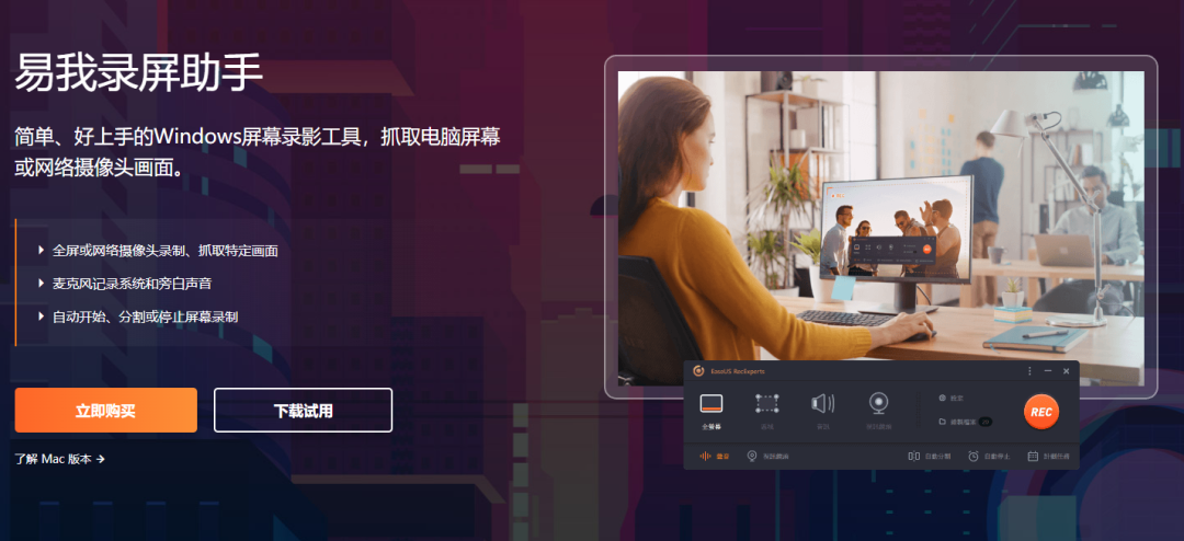 在此推荐易我录屏助手,该软件适用于Windows和Mac系统,操作简单、功能全面,它支持屏幕、应用窗口、声音、摄像头、游戏等的录制,多种用户录屏场景都能实现。