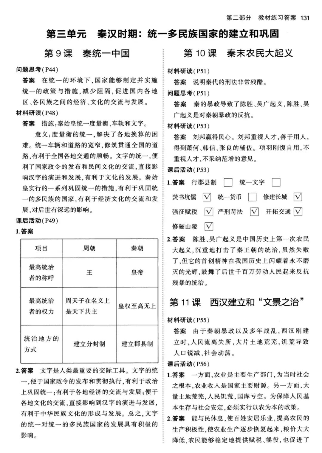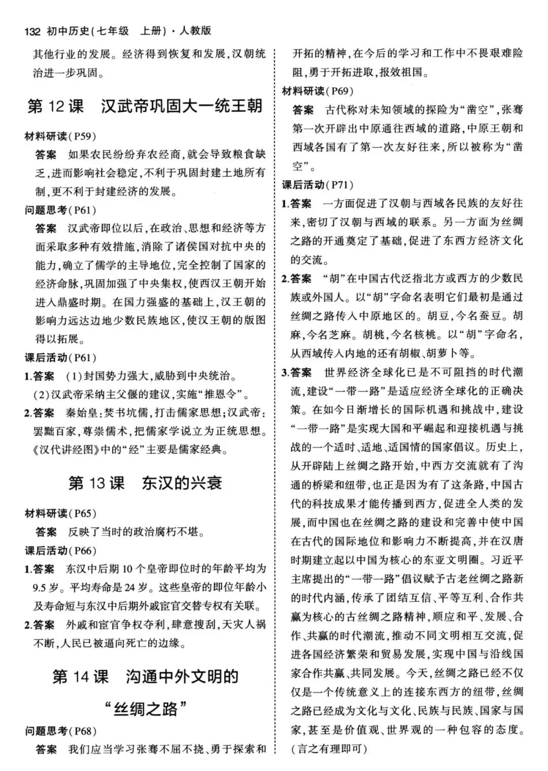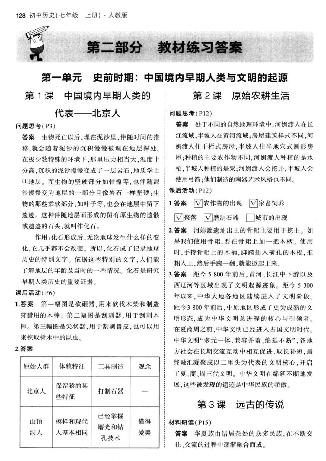 以下是人教版初中历史教材七年级上册课后习题参考答案,仅供参考。