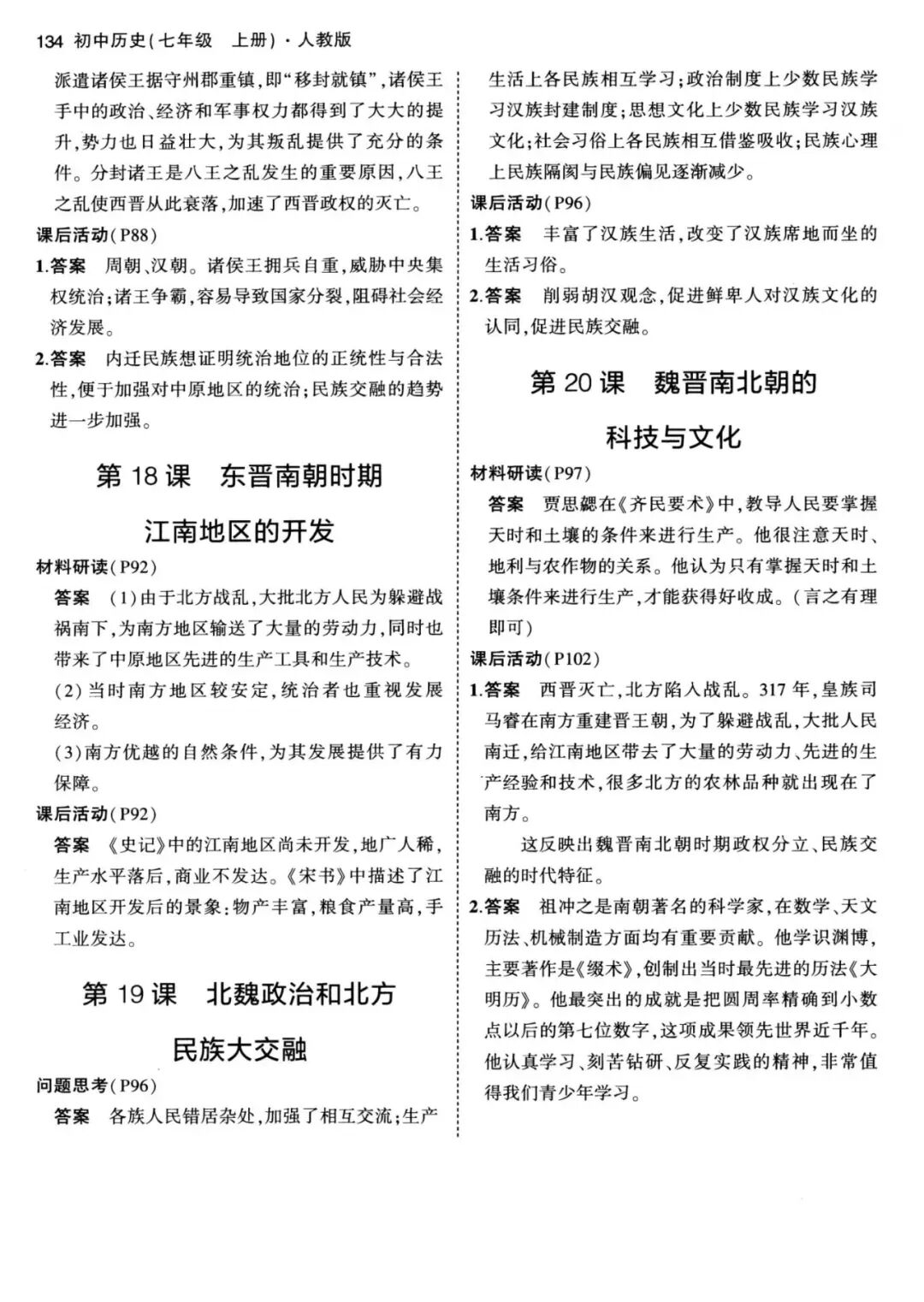 【人教版】初中历史《教材习题参考答案》七年级上册(最新版)