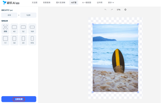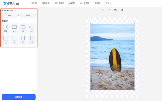 在左侧面板选你需要的比例 —— 想发抖音、小红书,就选 9:16 的竖版;想发公众号、朋友圈,就选16:9的横版,也能自己输入具体尺寸(比如1920×1080像素)。选好后点击 “立即处理”,等几秒到十几秒,就能看到效果了。