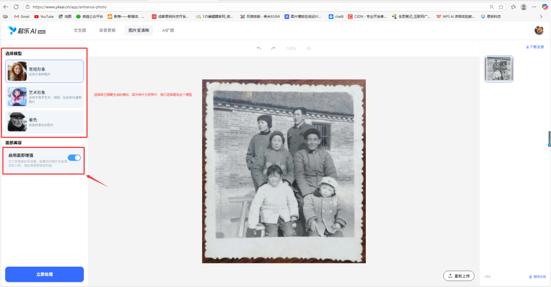 ② 选对模型:“常规形象” 通杀所有图,“艺术形象” 专救插画动漫,“着色” 能给老照片焕新颜;