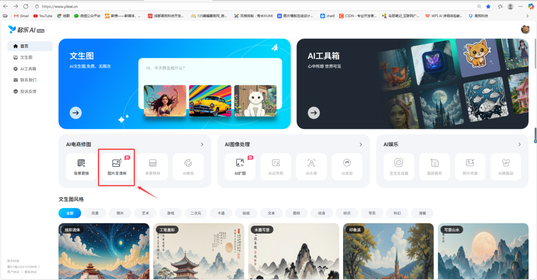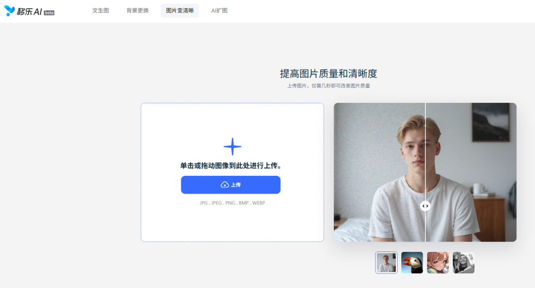 点击移乐AI官网「图片变清晰」入口,拖拽/选择文件,支持JPG/PNG/WEBP格式!
