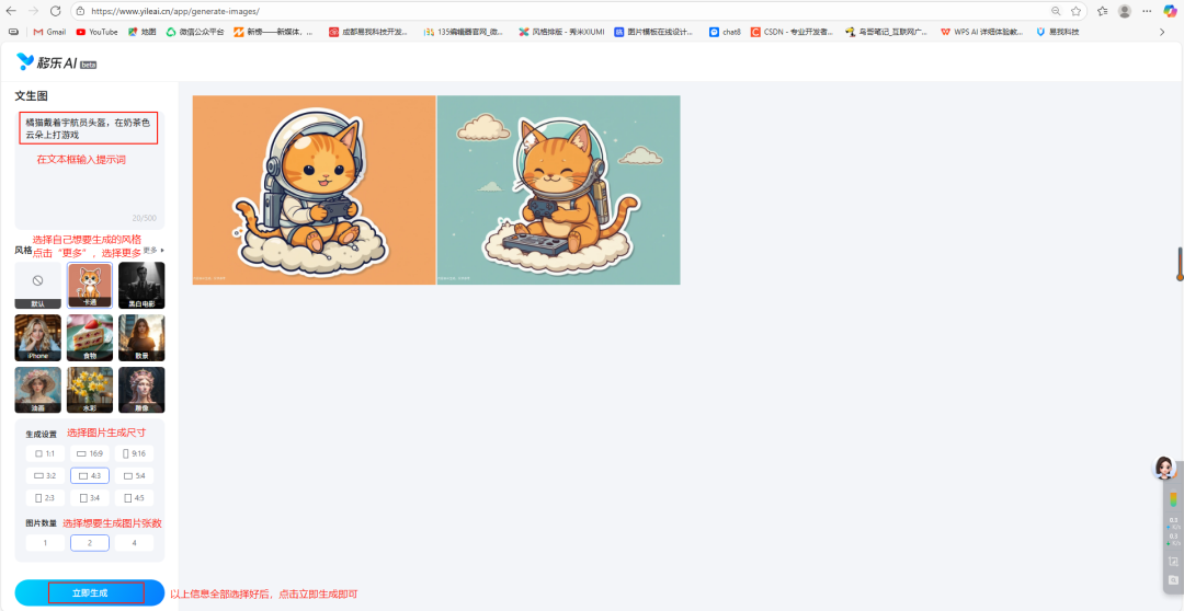 输入任何创意描述(如“一只橘猫戴着宇航员头盔,在奶茶色云朵上打游戏’的图”),仅需几秒钟,就能生成高清大图!