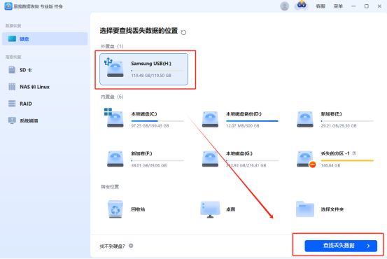 步骤一:将U盘插入电脑USB接口,打开软件。在软件界面中,选中丢失数据所在的U盘分区,点击“查找丢失数据”按钮。