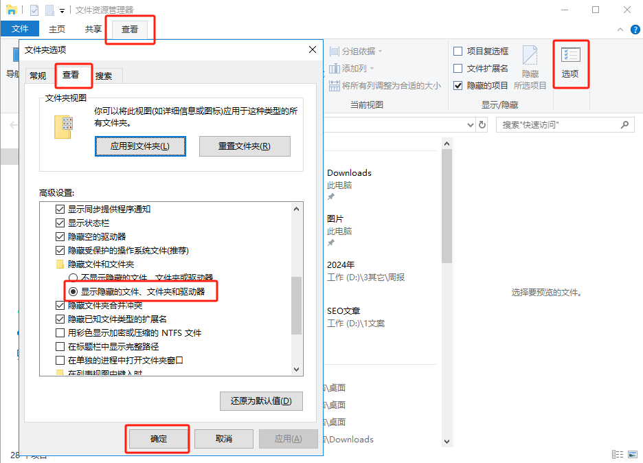 如果您希望显示更多隐藏选项,可以点击查看选项卡窗口下右侧的“选项”,在弹出的窗口中点击“查看”,在“高级设置”中找到并勾选“显示隐藏的文件、文件夹和驱动器”,然后点击“确定”。