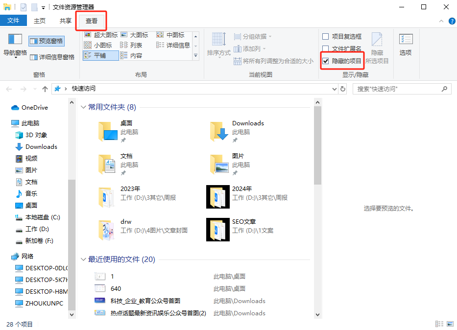 步骤2.在文件资源管理器选项窗口中,单击左上方“查看”选项卡,勾选“隐藏的项目”,随后隐藏的文档等项目就会显示出来。