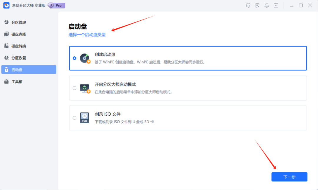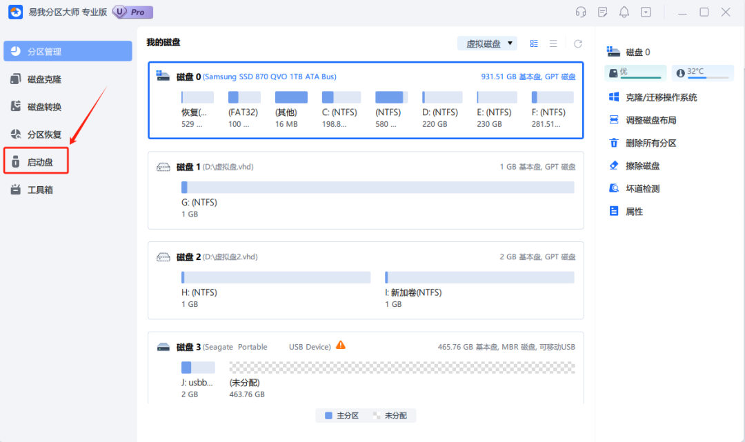 1、把USB设备连接到电脑上,启动易我分区大师,点击“启动盘”。